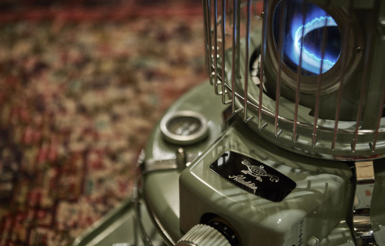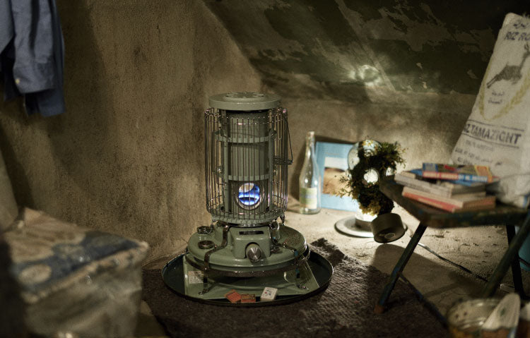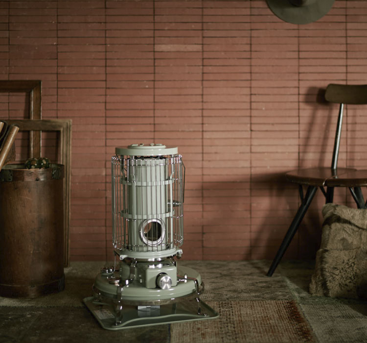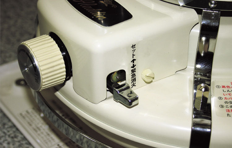 「ブルーフレームヒーター」の対震自動消火装置は、セットレバーとしんを上げるだけでセットされるしん降下式。これは内蔵の感震器が敏感に地震動をキャッチし瞬時に消火します。