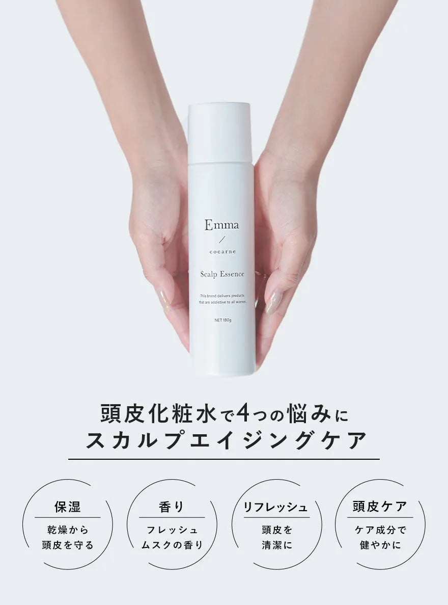 エマコッカーナ スカルプエッセンスは、天然由来の頭皮ケア成分が潤いを与え、頭皮のエイジングケアをサポートします。