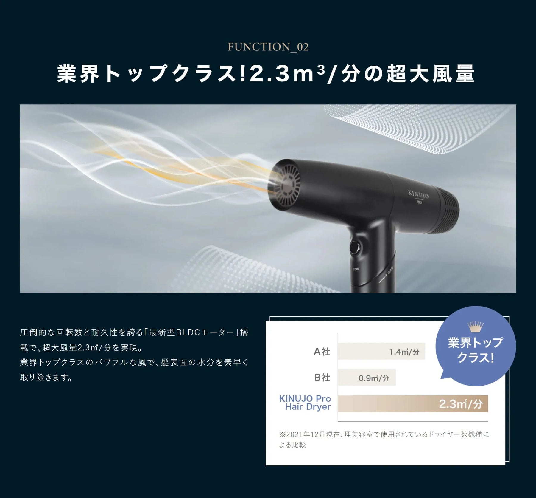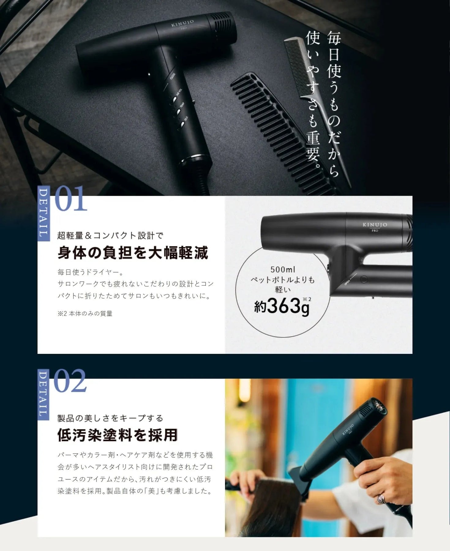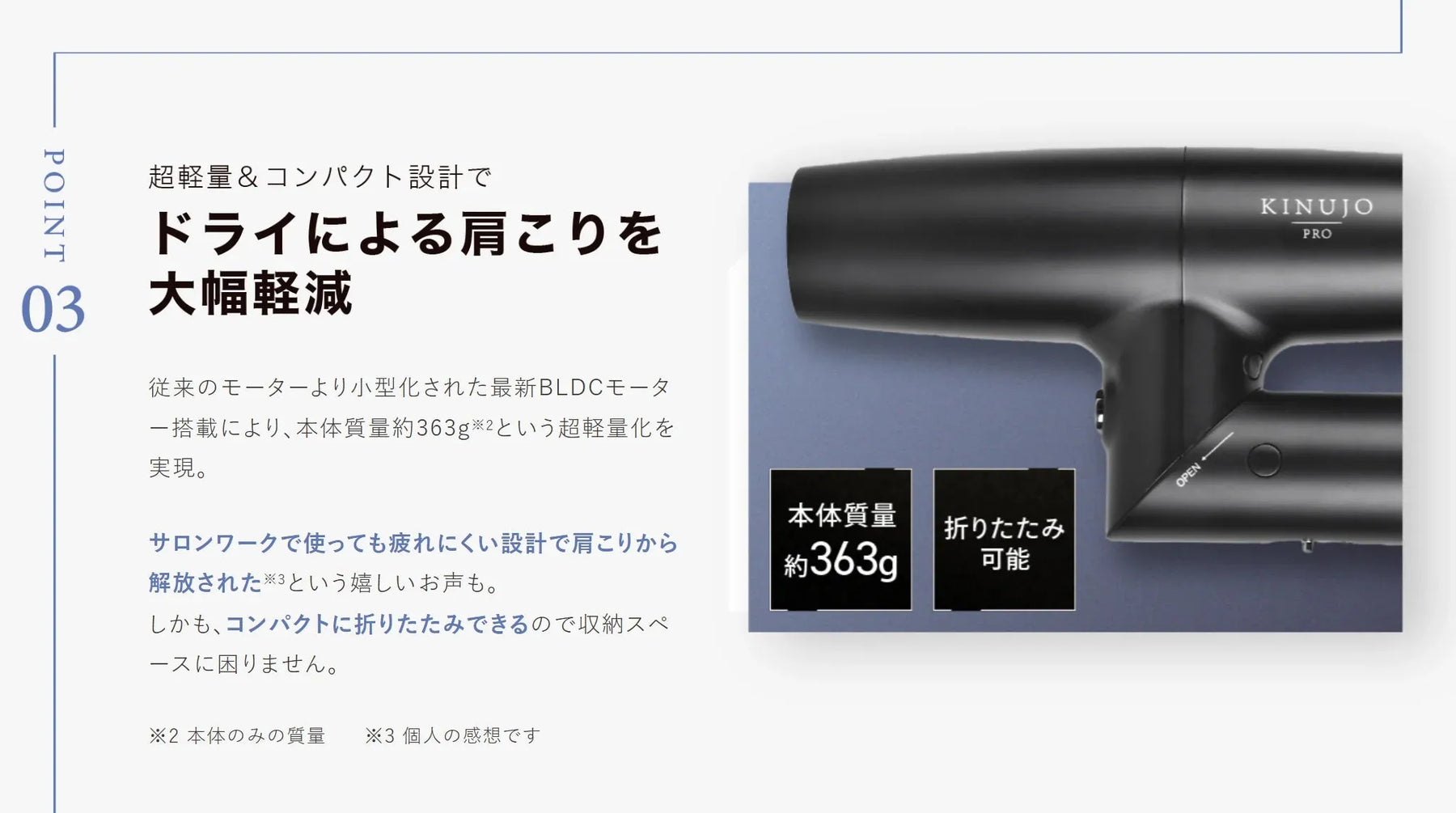 業界トップクラスの超大風量と軽量設計(本体のみ363g)でドライ時間を大幅カット。