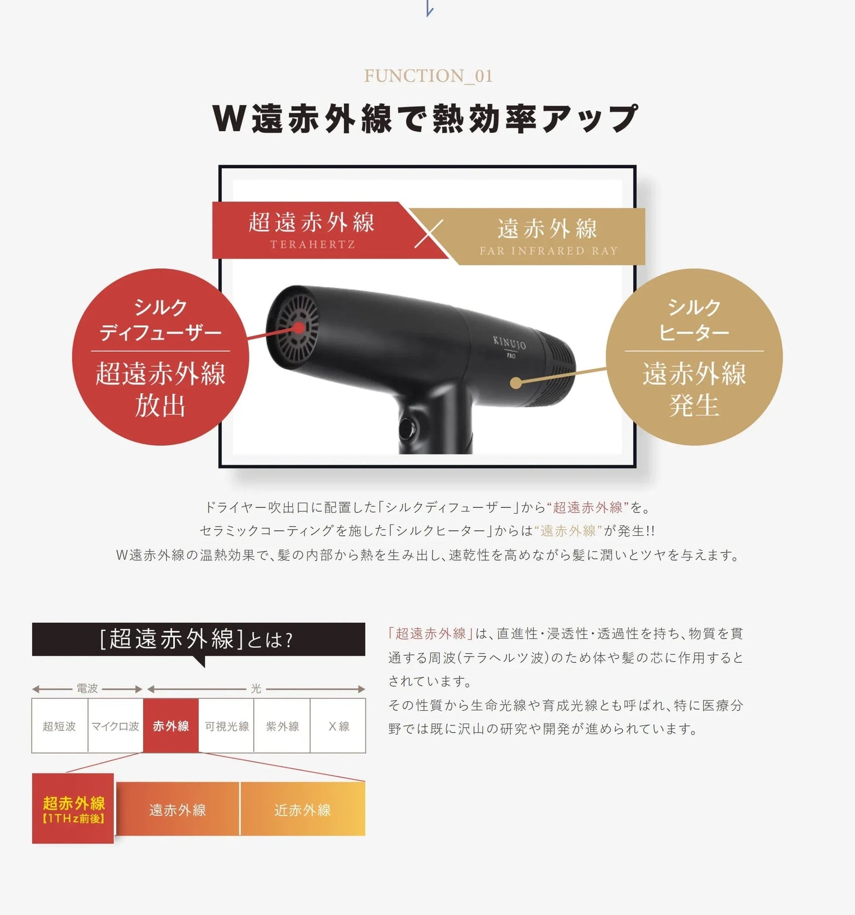 業界トップクラスの超大風量&パワフルな風圧に加え、ドライヤー吹出口に搭載した「シルクディフューザー」と「シルクヒーター」から2種類の遠赤外線が発生。