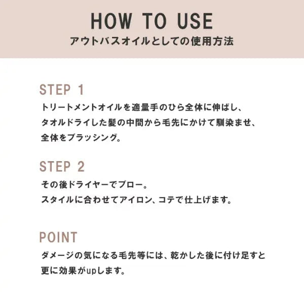 トリートメントオイルを適量手のひら全体に伸ばし、タオルドライした髪の中間から毛先にかけて馴染ませ、全体をブラッシング。 その後ドライヤーでブロー。スタイルに合わせてアイロン、コテで仕上げます。 ダメージの気になる毛先等には、乾かした後に付け足すと更に効果がupします。 ■使用量のお目安 ・ショート:1-2プッシュ ・ミディアム:3-4プッシュ ・ロング:5-6プッシュ ※量の目安は髪の長さ、量によって使用量を調整してください。 ※ナイトケアの場合は+1プッシュでご利用ください。