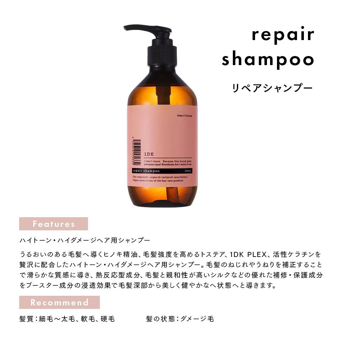 うるおいのある毛髪へ導くヒノキ精油、毛髪強度を高めるトステア、1DK PLEX、活性ケラチンを贅沢に配合したダメージヘア用シャンプー。毛髪のねじれやうねりを補正することで滑らかな質感に導き、熱反応型成分、毛髪と親和性が高いシルクなどの優れた補修・保護成分をブースター成分の浸透効果で毛髪深部から美しく健やかなへ状態へと導きます。